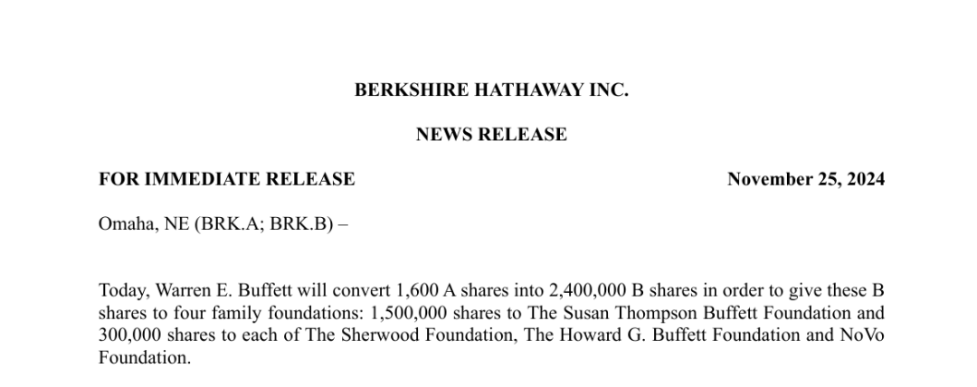 11月25日,伯克希尔哈撒韦公司发布声明,沃伦·巴菲特将其抓有的1600股伯克希尔公司A类股份,调理成240万股B类股份,同期将这些股份赠与4家眷属基金会。